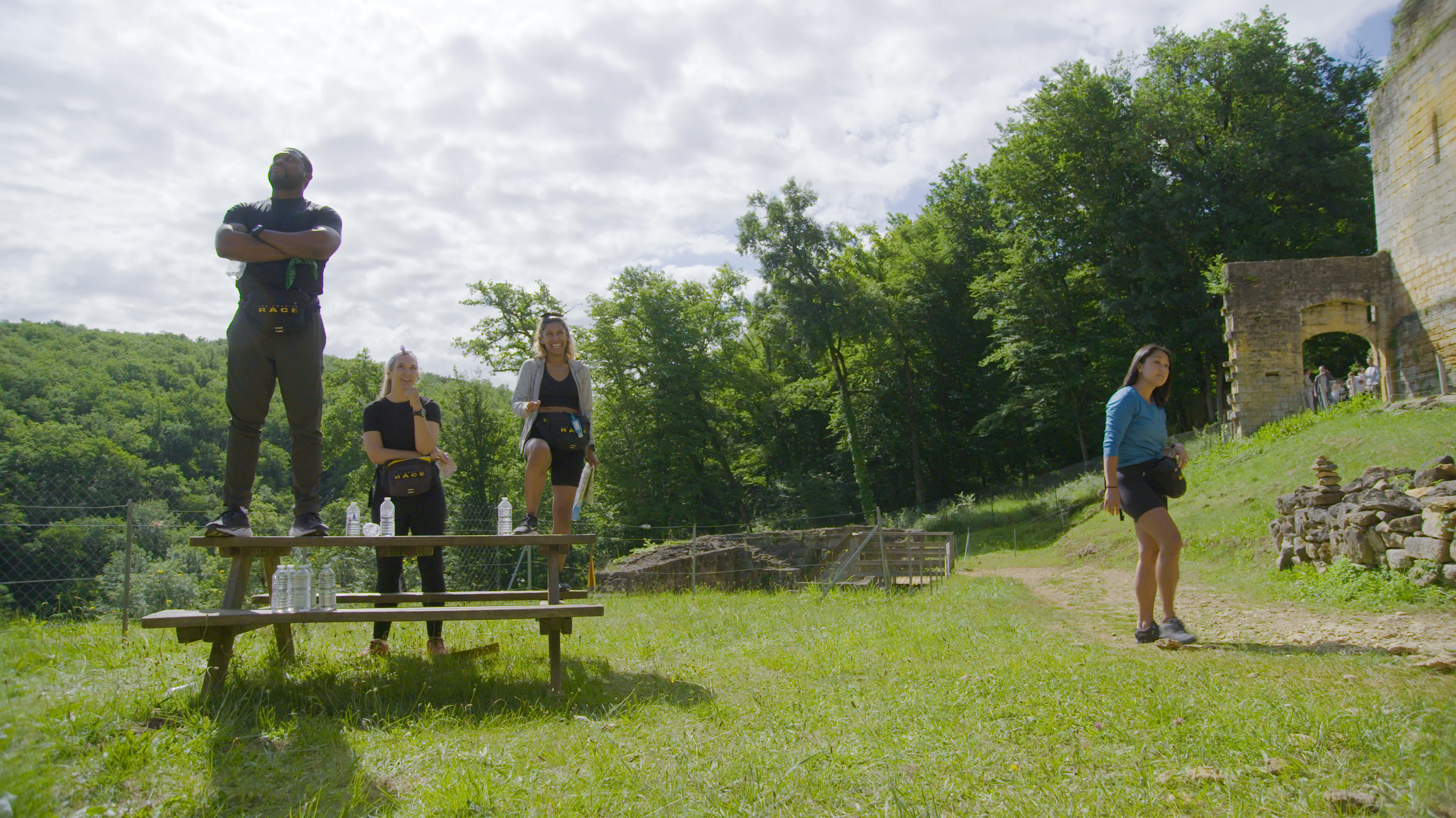 “It’s Simply Medi” – Teams drive to Dordogne, France, the city of 1,001 castles, where they will extract walnut oil, play three medi games and flex their memory muscles while rappelling down the side of a castle, on the CBS Original series THE AMAZING RACE, Wednesday, Nov. 2 (9:59-11:00 PM, ET/PT) on the CBS Television Network, and available to stream live and on demand on Paramount+. Phil Keoghan is the host. Pictured (L-R): Marcus Craig, Claire Rehfuss, Aubrey Ares, and Molly Sinert. Photo: CBS ©2022 CBS Broadcasting, Inc. All Rights Reserved. Highest quality screengrab available.
