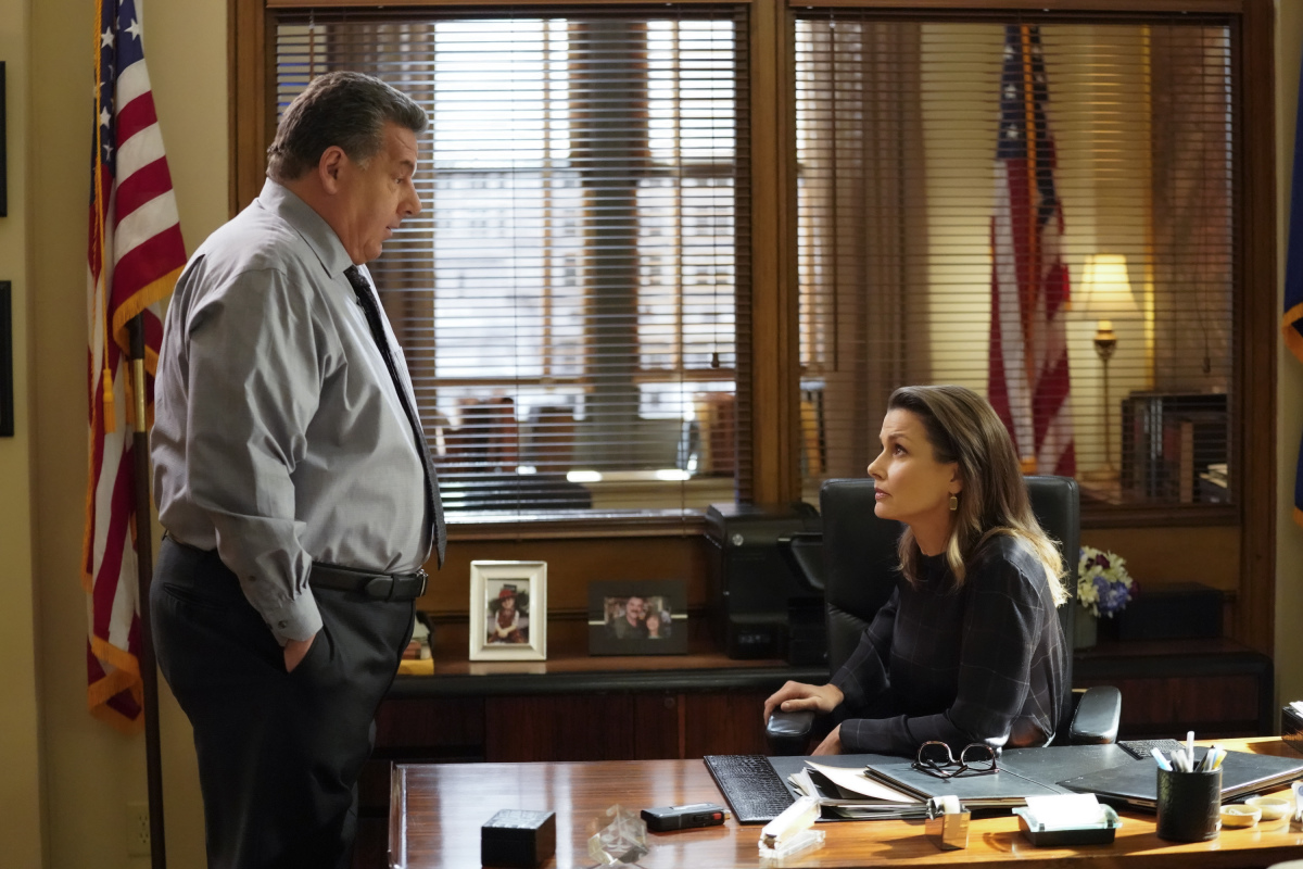 "Vested Interests" -- Jamie is under investigation after his police vest is found on a perp, and Frank debates whether to aid and protect an old friend, Chuck Kennedy (Ed Asner), whose home was invaded. Also, Danny and Baez investigate the suspicious circumstances surrounding the death of a hotel employee believed to be a suicide, and Erin asks Anthony to make a deal with a man who knows secrets about the current D.A., on BLUE BLOODS, Friday, March 6 (10:00-11:00 PM, ET/PT) on the CBS Television Network. Pictured: Bridget Moynahan as Erin Reagan, Steven Schirripa as Anthony Abetamarco. Photo: John Paul Filo/CBS ©2020CBS Broadcasting Inc. All Rights Reserved.