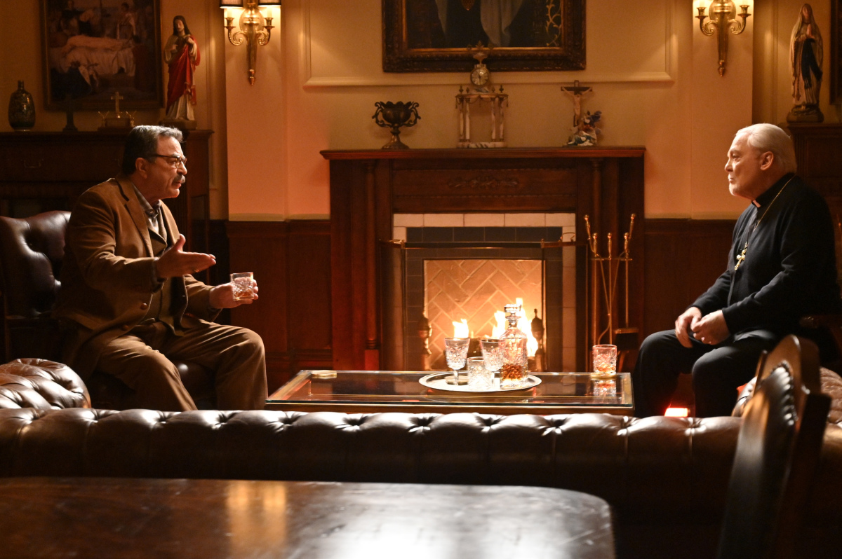 "Hide in Plain Sight" -- Danny and Baez are faced with tracking down a drug dealer after two young models are found dead from an overdose. Also, Eddie and Jamie team up to determine who the mastermind is behind a robbery, on BLUE BLOODS, Friday, April 24 (10:00-11:00 PM, ET/PT) on the CBS Television Network. Pictured: Stacy Keach as Archbishop Kevin Kearns, Tom Selleck as Frank Reagan. CBS Photo: John Paul Filo ©2020 CBS Broadcasting Inc. All Rights Reserved.