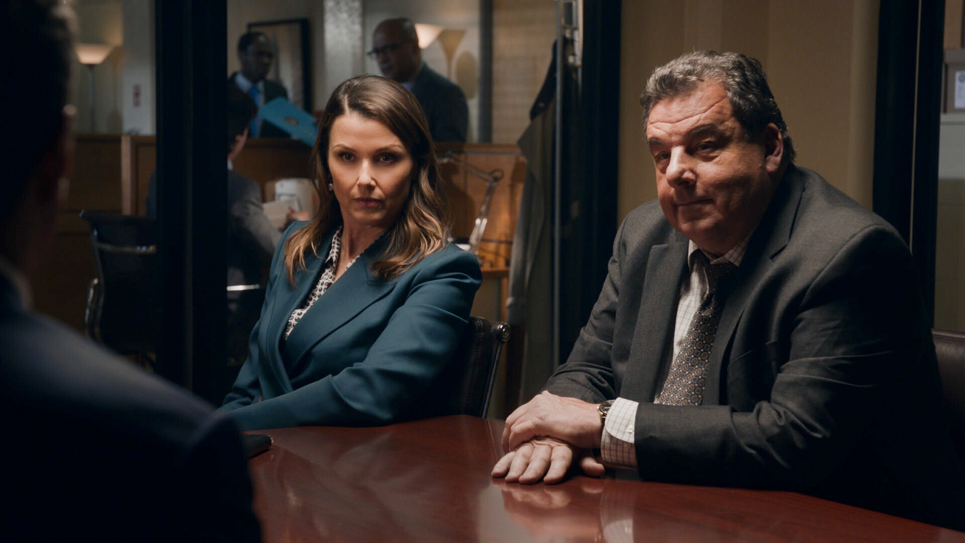 “Dropping Bombs” – Danny and Baez join forces with Danny’s old partner, Jackie Curatola (Jennifer Esposito), when a serial killer reappears. Also, Eddie faces backlash whens she tries to help a woman who accuses a sergeant of rape; Jamie clashes with his nephew, Joe Hill (Will Hochman), when Joe interferes with Jamie’s undercover operation; and Frank is blindsided when Mayor Chase publicly suggests bringing back a Commission of Police, on BLUE BLOODS, Friday, Feb. 23 (10:00-11:00 PM, ET/PT) on the CBS Television Network, and streaming on Paramount+ (live and on demand for Paramount+ with SHOWTIME subscribers, or on demand for Paramount+ Essential subscribers the day after the episode airs)*. Pictured (L-R): Bridget Moynahan as Erin Reagan Boyle and Steve Schirripa as Anthony Abetemarco Photo: CBS ©2023 CBS Broadcasting, Inc. All Rights Reserved. Highest quality screengrab available.