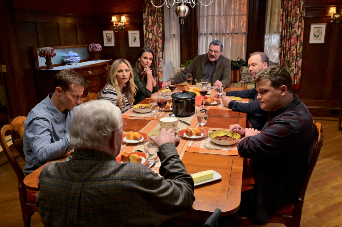 Blue Bloods stars Tom Selleck (Frank Reagan), Donnie Wahlberg (Danny Reagan), Bridget Moynahan (Erin Reagan). Will Estes (Jamie Reagan), Len Cariou (Henry Reagan), Marisa Ramirez (Det. Maria Baez), and Vanessa Ray (Officer Eddie Janko).