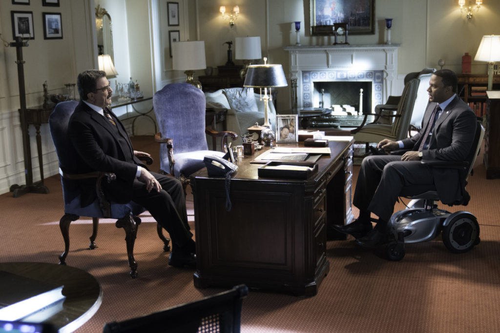 "The Thin Blue Line" -- When Danny intercepts a shipment of several million dollars that was heading to a drug cartel in Mexico, he becomes a target when they come back for revenge. Also, Jamie works independently to track down a serial killer who preys on the elderly, and Mayor Poole (David Ramsey) confides in Frank that he plans to retire, on the seventh season finale of BLUE BLOODS, Friday, May 5 (10:00-11:00 PM, ET/PT) on the CBS Television Network. Pictured: Tom Select, David Ramsey Photo: David M. Russell/CBS é2017 CBS Broadcasting, Inc. All Rights Reserved