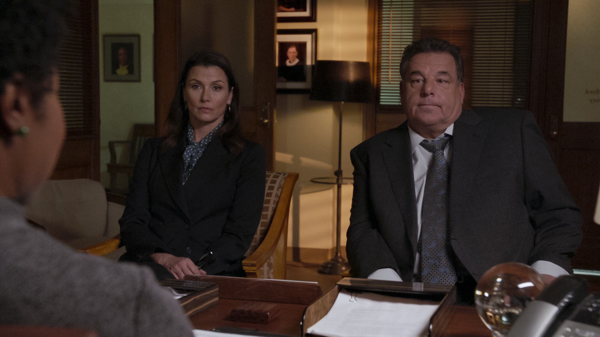 “Lost Ones” – Danny and Baez’s investigation into the death of a chess hustler is complicated by interference from the victim’s son. Also, Erin is offered an endorsement of her run for D.A. by an influential Harlem pastor in exchange for a professional favor; Gormley comes to Frank with a request regarding a disabled officer who has a connection to Danny; and Jamie tries to make amends with a man he regrets putting away as a young officer, on BLUE BLOODS, Friday, Jan. 20 (10:00-11:00 PM, ET/PT) on the CBS Television Network. Pictured: Bridget Moynahan as Erin Reagan and Steven Schirripa as Anthony Abetemarco. Photo: CBS ©2023 CBS Broadcasting, Inc. All Rights Reserved. Highest quality screengrab available.