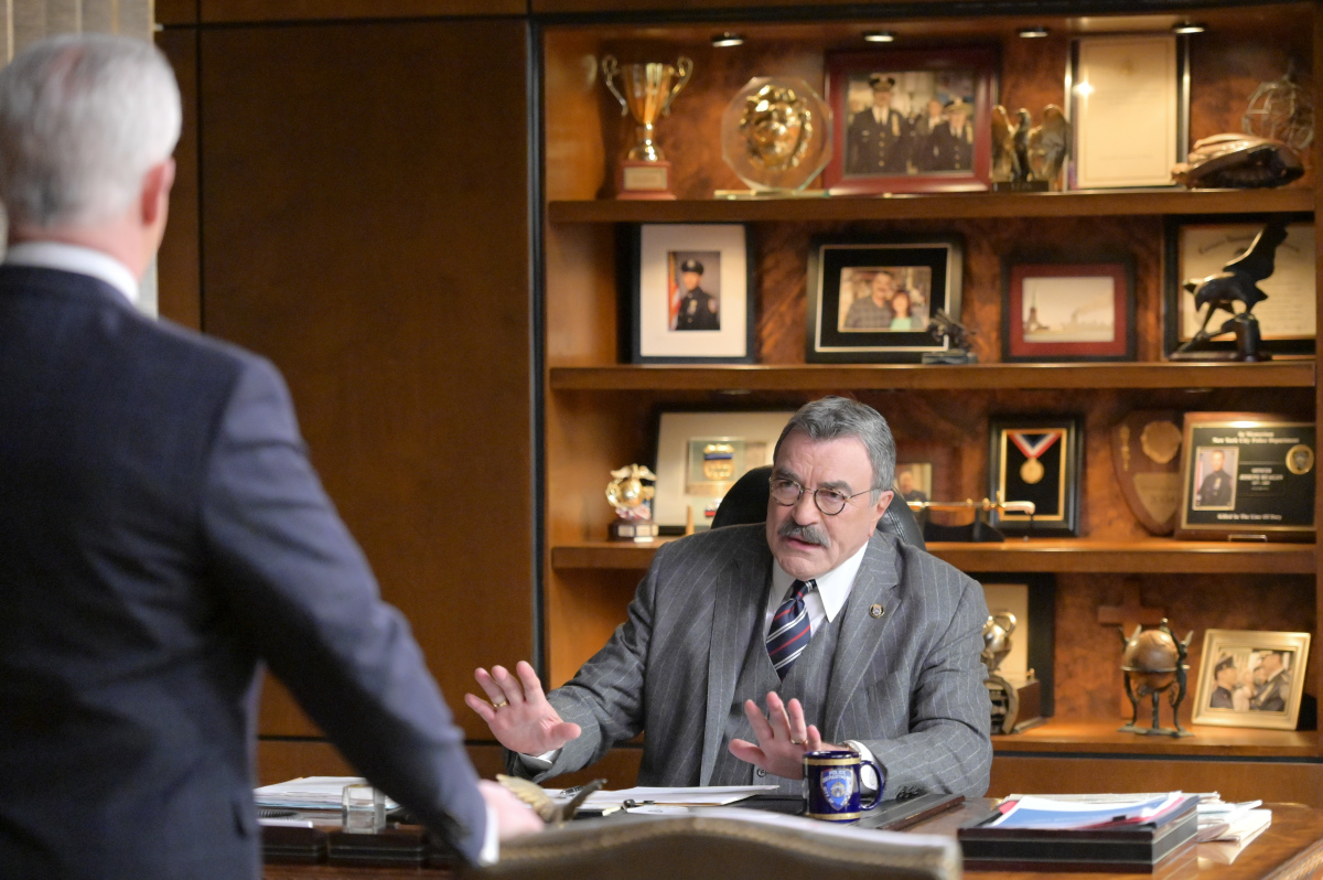 “The New You” – Frank and the Deputy Commisioner of Press Information, Garrett Moore (Gregory Jbara), quarrel when Garrett refuses to walk back a quote he provided to a local newspaper. Also, Danny and Baez discover a connection to a feud between local residents and city sponsored hotels for the homeless while investigating a murder, Anthony is mistaken for a mafioso and Eddie pressures Jamie to take a love language quiz, on BLUE BLOODS, Friday, May 7 (10:00-11:00 PM, ET/PT) on the CBS Television Network. Pictured: Gregory Jbara as DCPI Garrett Moore, Tom Selleck as Frank Reagan. Photo: John Paul Filo/CBS ©2021 CBS BROADCASTING INC. ALL RIGHTS RESERVED.