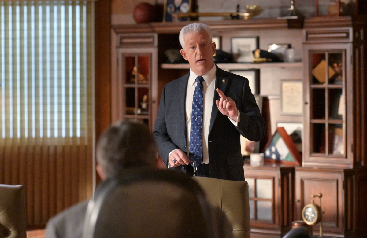 “The New You” – Frank and the Deputy Commisioner of Press Information, Garrett Moore (Gregory Jbara), quarrel when Garrett refuses to walk back a quote he provided to a local newspaper. Also, Danny and Baez discover a connection to a feud between local residents and city sponsored hotels for the homeless while investigating a murder, Anthony is mistaken for a mafioso and Eddie pressures Jamie to take a love language quiz, on BLUE BLOODS, Friday, May 7 (10:00-11:00 PM, ET/PT) on the CBS Television Network. Pictured: Gregory Jbara as DCPI Garrett Moore, Tom Selleck as Frank Reagan. Photo: John Paul Filo/CBS ©2021 CBS BROADCASTING INC. ALL RIGHTS RESERVED.