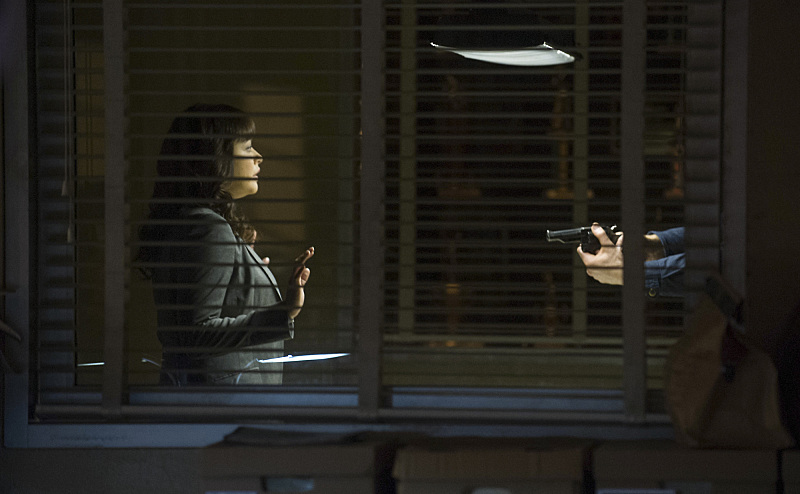 "In The Box" -- When an emotionally distraught man holds Baez hostage at gunpoint in an interrogation room after she served him with a restraining order, Danny must try to meet his demands before he harms her. Meanwhile, Frank is faced with a personal and moral dilemma when Garrett asks for help in dropping charges filed against his son, on BLUE BLOODS, Friday, Feb. 20 (10:00-11:00 PM, ET/PT) on the CBS Television Network. Dominic Fumusa guest stars as an emotionally distraught man. Pictured: Marisa Ramirez as Det. Maria Baez. Photo: Jeffrey Neira/CBS ©2015 CBS Broadcasting, Inc. All Rights Reserved.
