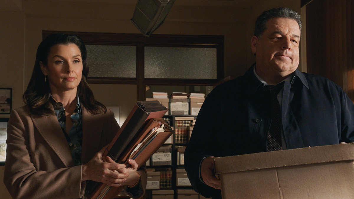 “Long Lost” – Frank faces a dilemma when a former Marine who becomes a local celebrity for saving a woman’s life, asks him to make an exception to the NYPD recruitment cut-off age so he can join the force. Also, an encounter with an old law school rival leads Erin to look into an alleged wrongful conviction; Jamie is torn over whether to report a sergeant close to Eddie, for punching a fellow officer; and Danny and Baez race the clock to find an abducted child;, on the CBS Original series BLUE BLOODS, Friday, April 8 (10:00-11:00 PM, ET/PT) on the CBS Television Network and available to stream live and on demand on Paramount+*. Pictured: Bridget Moynahan as Erin Reagan and Steven Schirripa as Anthony Abetemarco. Photo: CBS ©2022 CBS Broadcasting, Inc. All Rights Reserved. Highest quality screengrab available.