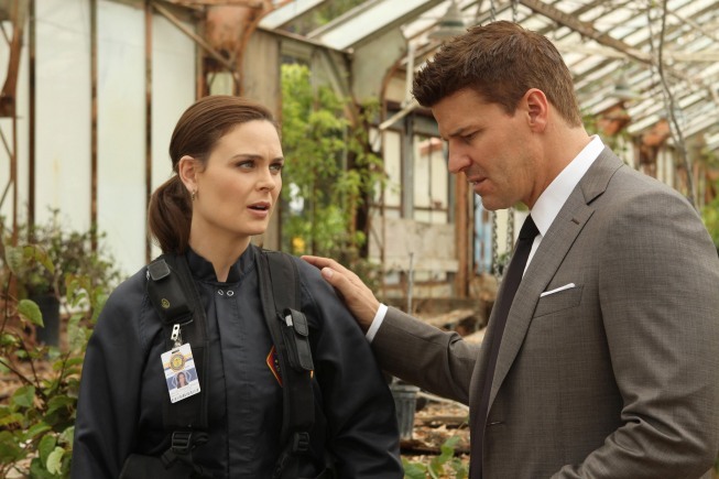 BONES: Brennan (Emily Deschanel, L) and Booth (David Boreanaz, R) investigate the remains of a young boy found in an abandoned greenhouse in the milestone 150th episode of BONES, "The Ghost in the Machine," airing Monday, Dec. 3 (8:00-9:01 PM ET/PT) on FOX. ©2012 Fox Broadcasting Co. Cr: Patrick McElhenney/FOX