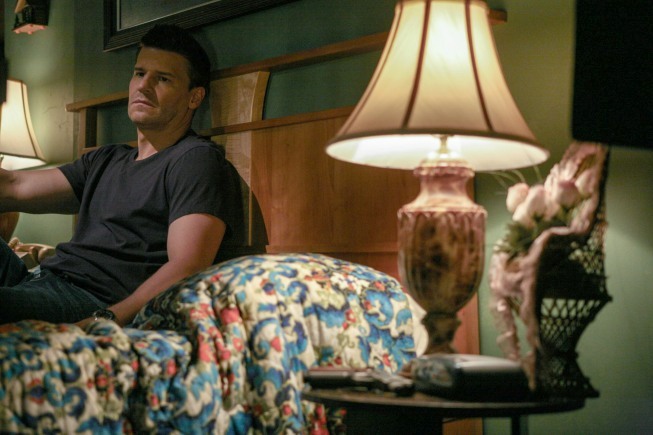 BONES: Booth (David Boreanaz, R) is cautious when he arranges to meet up with Brennan (Emily Deschanel, L) in the Season Eight premiere episode of BONES airing Monday, Sept. 17 (8:00-9:00 PM ET/PT) on FOX. ©2012 Fox Broadcasting Co. Cr: Beth Dubber/FOX