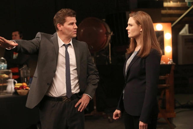 BONES: Brennan (Emily Deschanel, R) and Booth (David Boreanaz, L) arrive at a children's TV show set as part of their current investigation in the "The Carrot in the Kudzu" episode of BONES airing Monday, March 24 (8:00-9:00 PM ET/PT) on FOX. ©2014 Fox Broadcasting Co. Cr: Patrick McElhenney/FOX