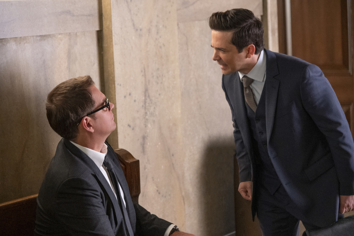 "Labor Days" - As Bull prepares for impending fatherhood at home, his work at TAC suffers without his top attorney, Benny, who quit the company in reaction to Bull's fling with his sister, Isabella (Yara Martinez), at their father's funeral. Meanwhile, the team faces a difficult time in court without Benny as they mount a defense for a young bartender on trial for involuntary manslaughter following an inebriated customer's mass killing, on BULL, Monday, Sept. 23 (10:00-11:00 PM, ET/PT) on the CBS Television Network. Pictured L-R: Michael Weatherly as Dr. Jason Bull and Freddy Rodriguez as Benny Col--n Photo: David M. Russell/CBS ©2019 CBS Broadcasting Inc. All Rights Reserved.