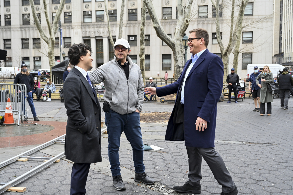 “Dark Horse” – Izzy hires Bull and TAC to defend a jockey accused of committing arson against a stable owner who fired him, on the CBS Original series BULL, Thursday, April 14 (10:00-11:00 PM, ET/PT) on the CBS Television Network and available to stream live and on demand on Paramount+.* Episode directed by Lou Diamond Phillips. Pictured: Director Lou Diamond Phillips and Michael Weatherly. Photo: Phil Caruso/CBS ©2022 CBS Broadcasting, Inc. All Rights Reserved.