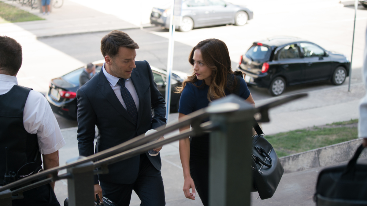 Burden of Truth -- "Crawford Chang" -- Image Number: BOT_Ep1_0229.jpg -- Pictured (L-R): Peter Mooney as Billy Crawford and Kristin Kreuk as Joanna Hanley -- Photo: © 2020 Cause One Productions Inc. and Cause One Manitoba Inc.