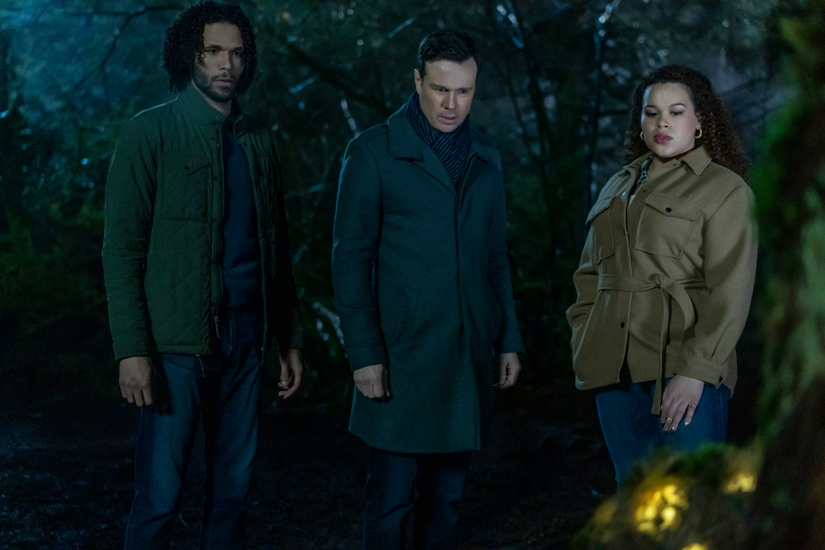 Charmed -- “The End is Never the End” -- Image Number: CMD413b_0495r -- Pictured (L - R): Jordan Donica as Jordan Chase, Rupert Evans as Harry Greenwood, and Mareya Salazar as Josefina -- Photo: Colin Bentley/The CW -- © 2022 The CW Network, LLC. All Rights Reserved.