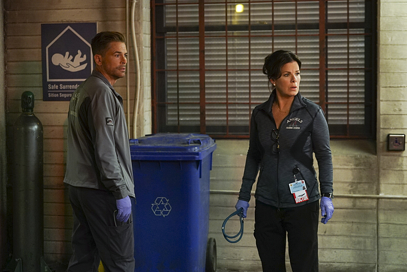 "Demons and Angels" -- On Halloween night, Willis, Noa and Elliott rush to the scene of a fire at a haunted theater, where Dr. Nolan (Kathleen Rose Perkins) and her boyfriend's son are trapped, on CODE BLACK, Wednesday, Oct. 26 (10:00-11:00 PM, ET/PT), on the CBS Television Network. Pictured: Rob Lowe (Col. Ethan Willis), Marcia Gay Harden (Dr. Leanne Rorish) Photo: Monty Brinton/CBS é2016 CBS Broadcasting, Inc. All Rights Reserved
