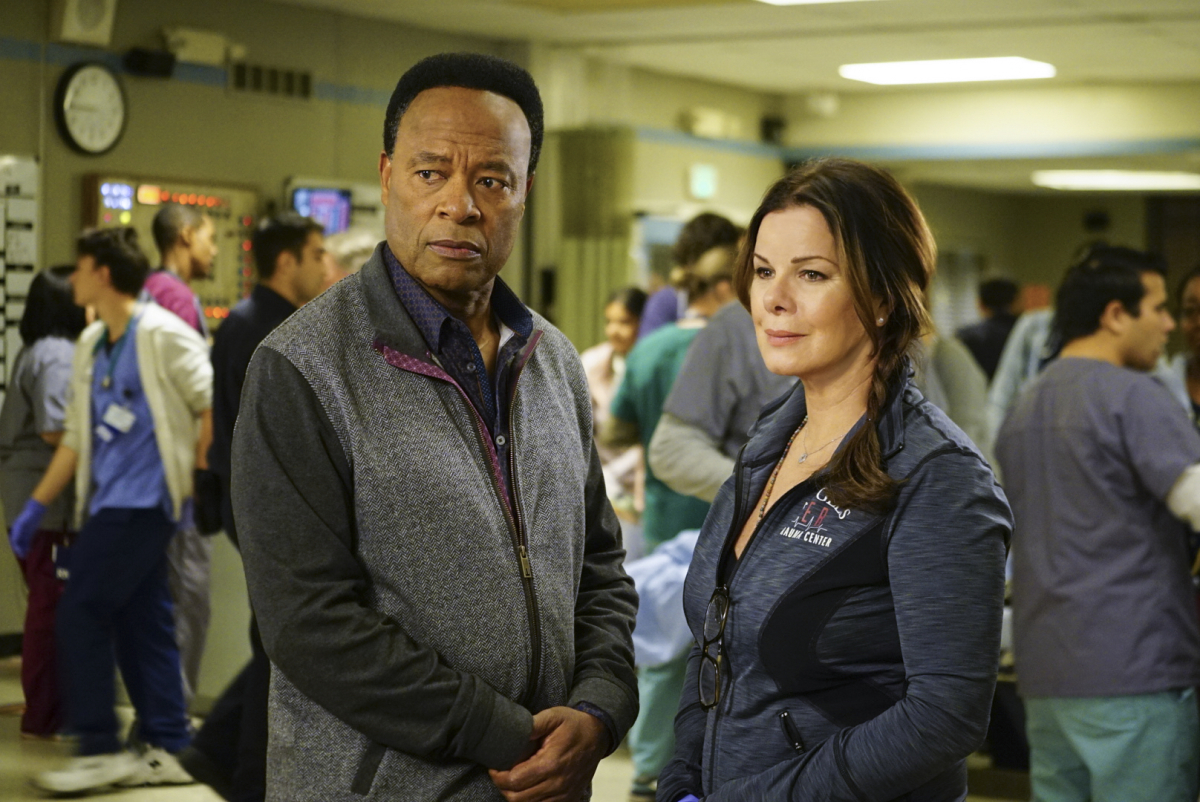 "Unfinished Business" -- As Guthrie takes on a new position as the hospital chaplain, he considers having a risky surgery to treat his Parkinson's. Also, the doctors treat patients who arrive at Angels from an apartment fire, on CODE BLACK, Wednesday, Jan. 11 (10:00-11:00PM, ET/PT) on the CBS Television Network. Pictured: William Allen Young (Dr. Rollie Guthrie), Marcia Gay Harden (Dr. Leanne Rorish) Photo: Sonja Flemming/CBS ©2016 CBS Broadcasting, Inc. All Rights Reserved