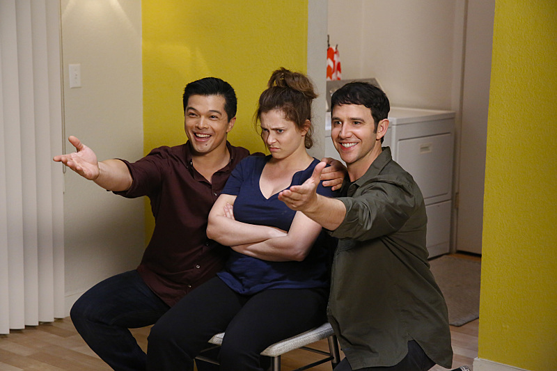 Crazy Ex Girlfriend -- "When Will Josh and His Friend Leave Me Alone?" -- Image Number: CEG204c_0234.jpg -- Pictured (L-R): Vincent Rodriguez III as Josh, Rachel Bloom as Rebecca and Santino Fontana as Greg -- Photo: Robert Voets/The CW -- ©2016 The CW Network, LLC All Rights Reserved.