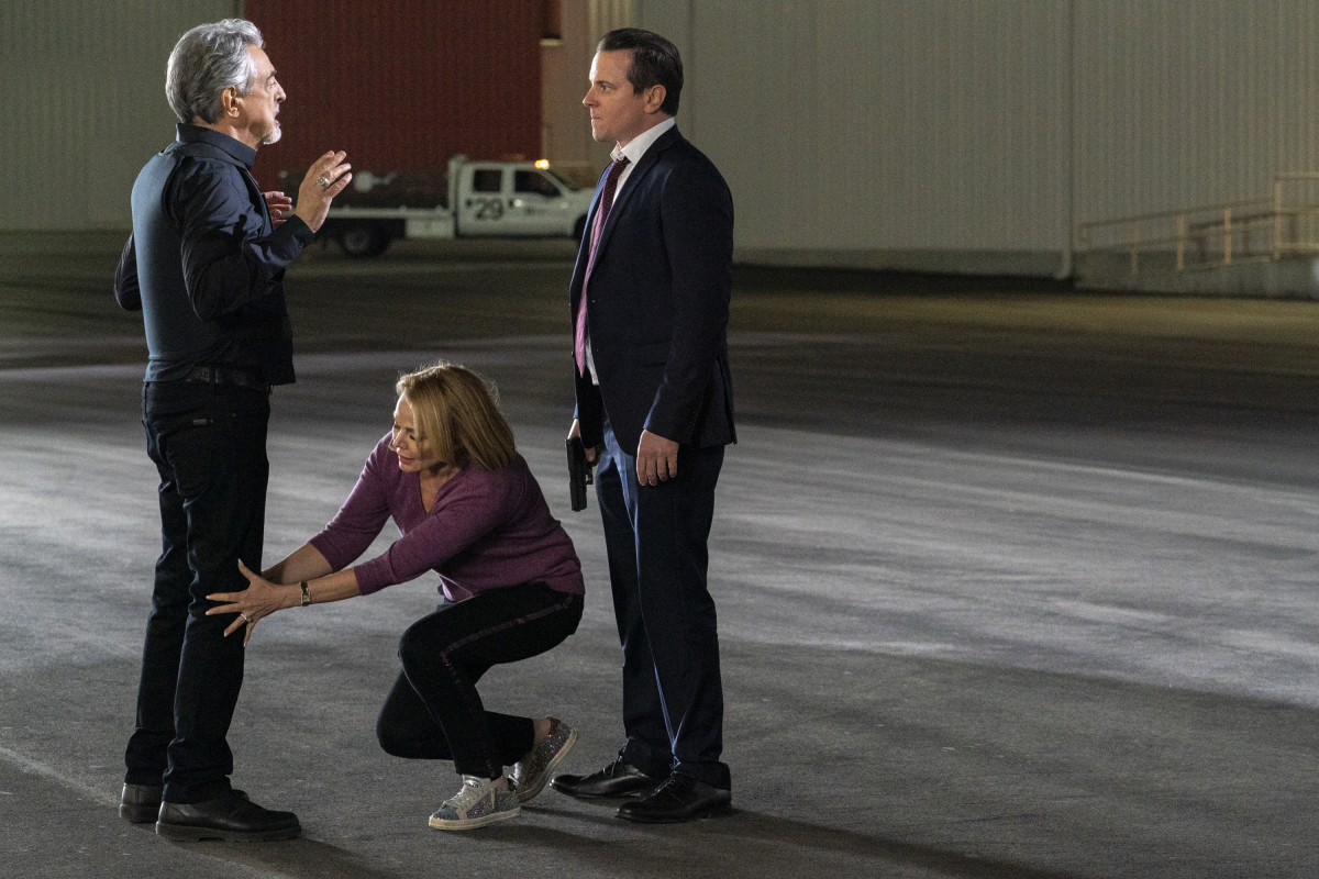 "And in the End" -- Following an explosive face-to-face encounter with Everett Lynch, a.k.a. "The Chameleon," Dr. Reid suffers from a brain injury and, while experiencing hallucinations, is visited by ghosts from his past. Also, the BAU makes a shocking discovery about Lynch that affects Rossi personally, and the entire BAU team comes together to celebrate Rossi's retirement, on the series finale of CRIMINAL MINDS, Wednesday, Feb. 19 (10:00-11:00 PM, ET/PT) on the CBS Television Network. Written by executive producer Erica Messer and series star Kirsten Vangsness. Pictured (L-R): Joe Mantegna as David Rossi, Gail O'Grady as Krystall Richards, and Michael Mosley as Everett Lynch Photo: Cliff Lipson/CBS ©2019 CBS Broadcasting, Inc. All Rights Reserved