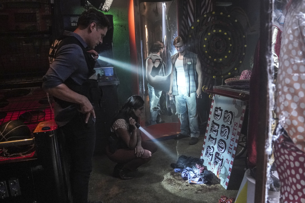 “Funhouse” – Max puts CSI on lockdown when evidence in a new murder tips Grissom and Sara to a new suspect in the crime lab. Also, Folsom and Allie investigate a series of chilling killings at a dilapidated clown-themed hotel, on the CBS Original series CSI: VEGAS, Wednesday, Nov. 10 (10:00-11:00 PM, ET/PT) on the CBS Television Network, and available to stream live and on demand on Paramount+. Pictured L-R: Matt Lauria as Josh Folsom, Mandeep Dhillon as Allie Rajan, and Shane Graham as Tom Photo: Sonja Flemming/CBS ©2021 CBS Broadcasting, Inc. All Rights Reserved.