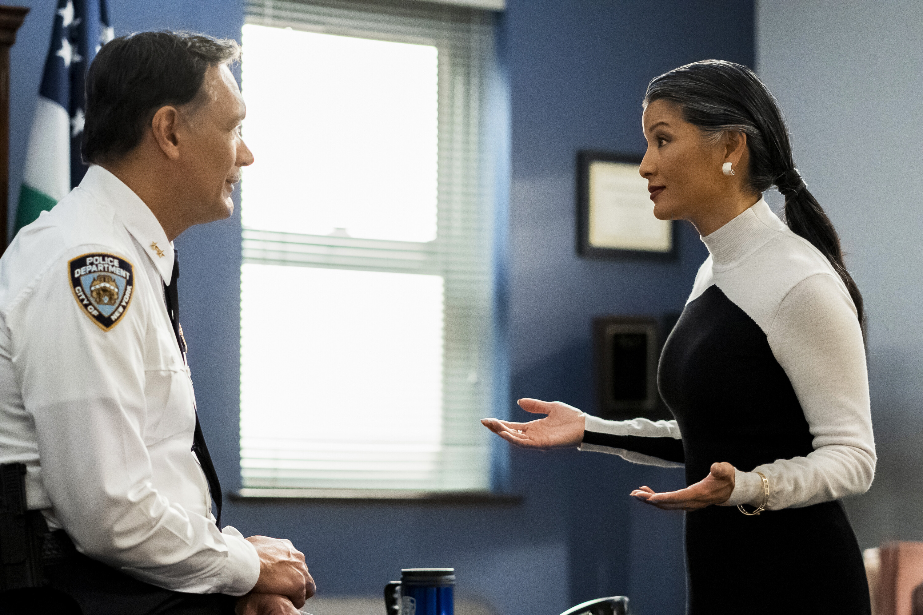 “We Didn’t Start the Fire” – When the 7-4 investigates a fatal fire at a hair salon, Killian and Morales turn to Dr. Ken Corley (Brian Stokes Mitchell), a medical examiner with ties to Regina’s past, and fire marshal Nicky Greenville (Lea DeLaria) for crucial insight. Also, Haywood announces a new policy without discussing it with Suarez, and Quinlan worries about Bentley’s worsening nightmares, on EAST NEW YORK, Sunday, Feb. 26 (9:00-10:00 PM, ET/PT) on the CBS Television Network and available to stream live and on demand on Paramount+. Pictured (L-R): Jimmy Smits as Chief John Suarez and Kelly Hu as Allison Cha. Photo Credit: Scott McDermott / 2022 Warner Bros. Entertainment Inc. All Rights Reserved.