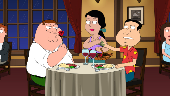 When Peter, Quagmire and Joe visit the Harvard University campus, Quagmire accidentally marries a prostitute. In order to get out of his marriage, Quagmire pretends to be lovers with Peter on an all-new “The Giggity Wife” episode of FAMILY GUY airing Sunday, Jan. 27 (9:00-9:30 PM ET/PT) on FOX. (FG-1009) (TV-14 D, L, S, V)