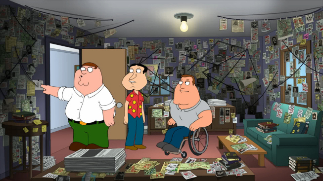 The criminal (guest voice Will Sasso) who, years ago, shot Joe and left him in a wheelchair, becomes a fugitive. So, Quagmire, Joe and Peter team up to hunt the bad guy down in the all-new “Joe’s Revenge” episode of FAMILY GUY airing Sunday, Nov. 18 (9:00-9:30 PM ET/PT) on FOX. (FG-1003) (TV-14 D, L, S, V)