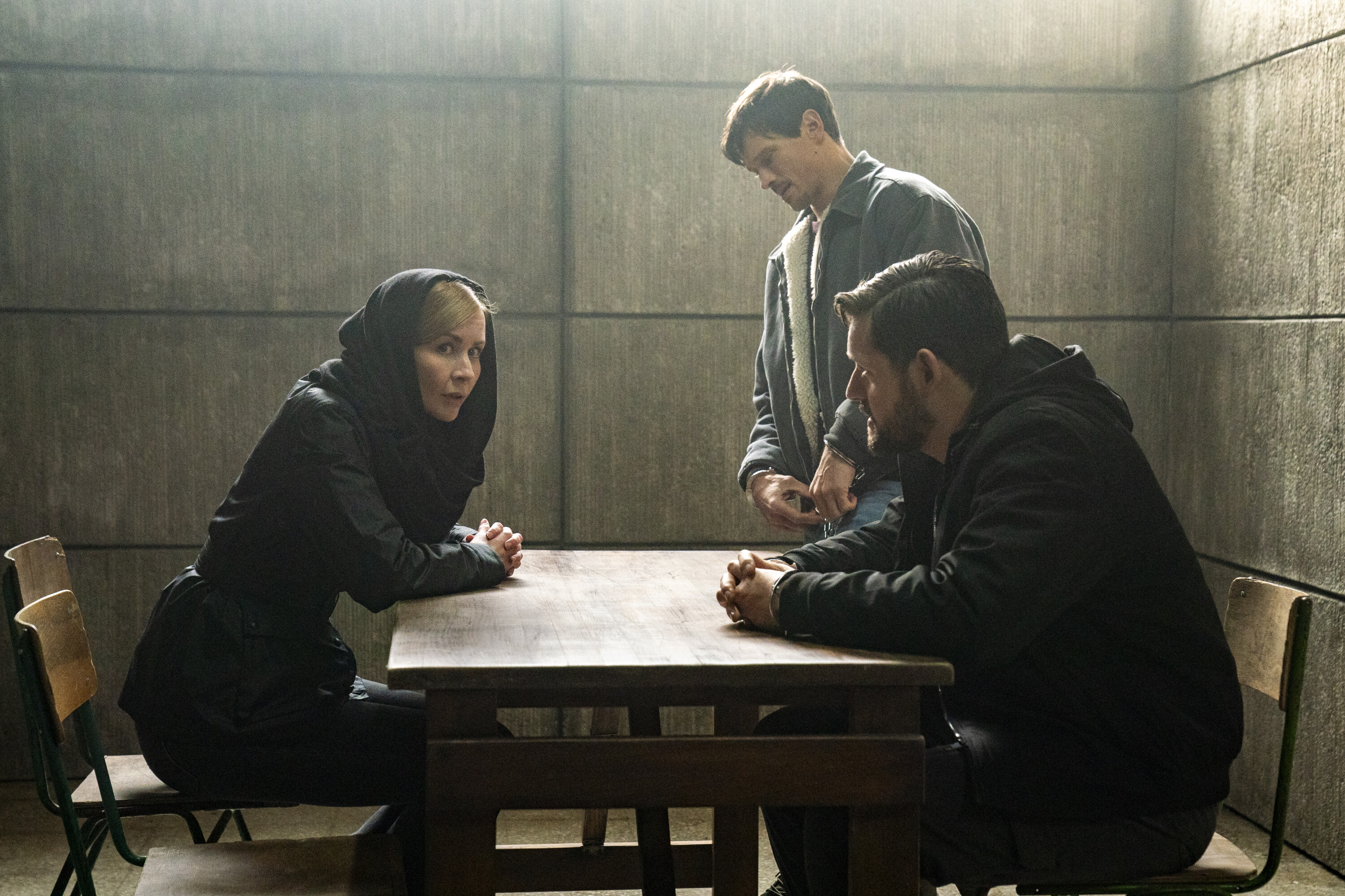 “The Last Stop” – When ex-FBI agent Bill Cormack (guest star Jeffrey Pierce), captured by hostile forces in Libya years ago, suddenly resurfaces in a brutal Tripoli prison, Forrester and Powell risk everything to go undercover as prisoners to break him out. Also, the Fly Team adjusts to their new and improved HQ, on FBI: INTERNATIONAL, Tuesday, Feb. 20 (9:00-10:00 PM, ET/PT) on the CBS Television Network, and streaming on Paramount+ (live and on demand for Paramount+ with SHOWTIME subscribers, or on demand for Paramount+ Essential subscribers the day after the episode airs). Pictured (L-R): Eva-Jane Willis as Europol Agent Megan “Smitty” Garretson, Greg Hovanessian as Damien Powell, and Luke Kleintank as Special Agent Scott Forrester. Photo: Nelly Kiss/CBS ©2023 CBS Broadcasting, Inc. All Rights Reserved.