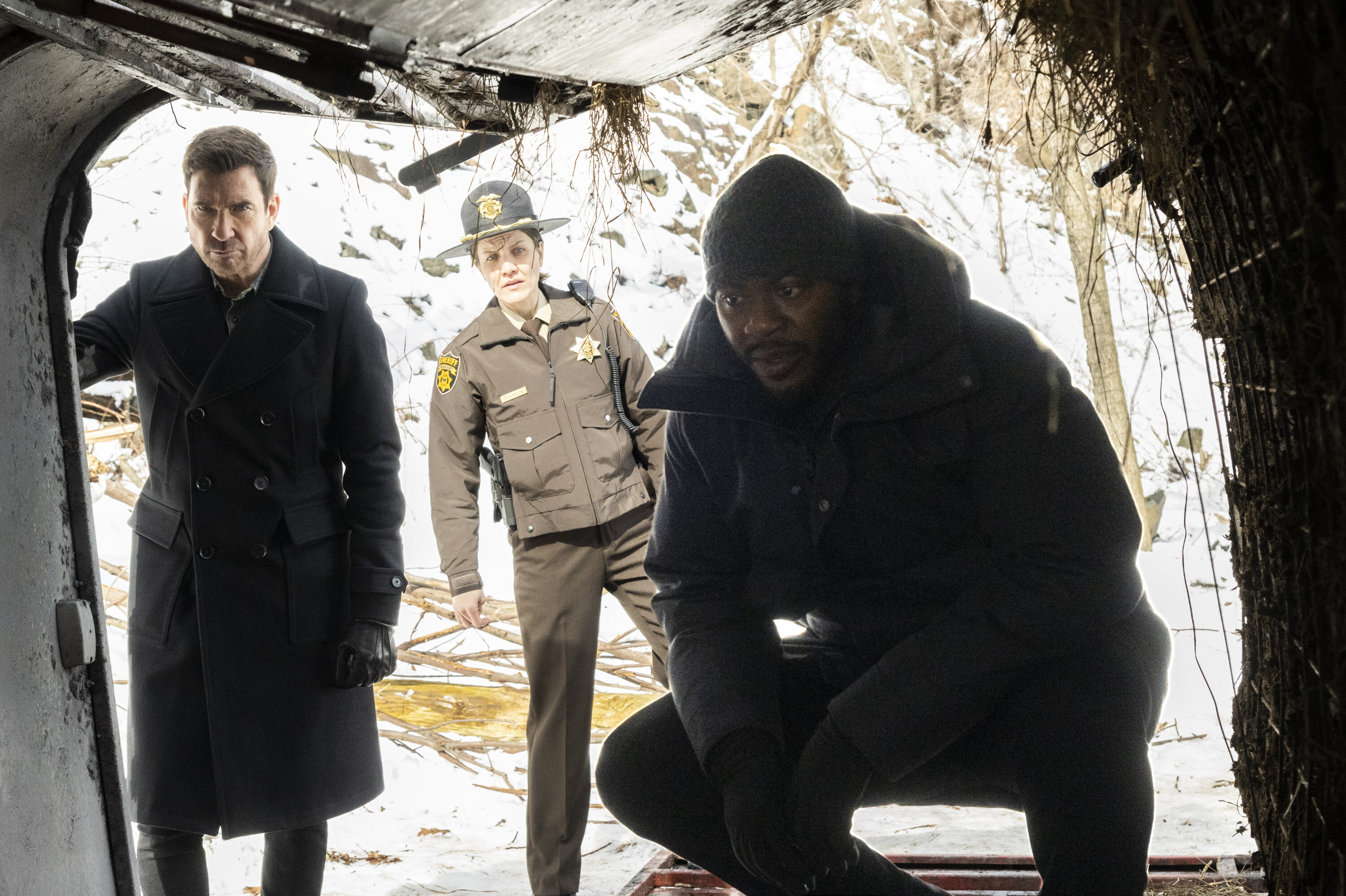 “Rangeland” – After two agents from the Bureau of Land Management go missing while executing a land seizure warrant in Wyoming, the Fugitive Task Force heads west to track them down in an unwelcoming county. Also, Hana receives a threat, on the CBS Original series FBI: MOST WANTED, Tuesday, April 18 (10:00-11:00 PM, ET/PT) on the CBS Television Network, and available to stream live and on demand on Paramount+. Pictured (L-R): Alexa Davalos as Special Agent Kristin Gaines, Rosie Benton as Sheriff Franklin, and Edwin Hodge as Special Agent Ray Cannon. Photo: Mark Schäfer/CBS ©2023 CBS Broadcasting, Inc. All Rights Reserved.