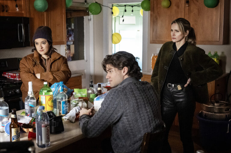 “Greek Tragedy” – When two sorority sisters are found stabbed to death in their off-campus home, the Fugitive Task Force heads to Virginia to hunt down the suspect before more killings occur. Meanwhile, Hana agrees to meet with Ethan after he asks her for help with his latest troubles, on FBI: MOST WANTED, Tuesday, Feb. 25 (10:00-11:00 PM, ET/PT) on the CBS Television Network, and streaming on Paramount+ (live and on demand for Paramount+ with SHOWTIME subscribers, or on demand for Paramount+ Essential subscribers the day after the episode airs). Pictured (L-R): Keisha Castle-Hughes as Special Agent Hana Gibson, Stephen Matthew Smith as Nick Turpin, and Shantel VanSanten as Special Agent Nina Chase. Photo: Mark Schafer/CBS ©2024 CBS Broadcasting, Inc. All Rights Reserved.