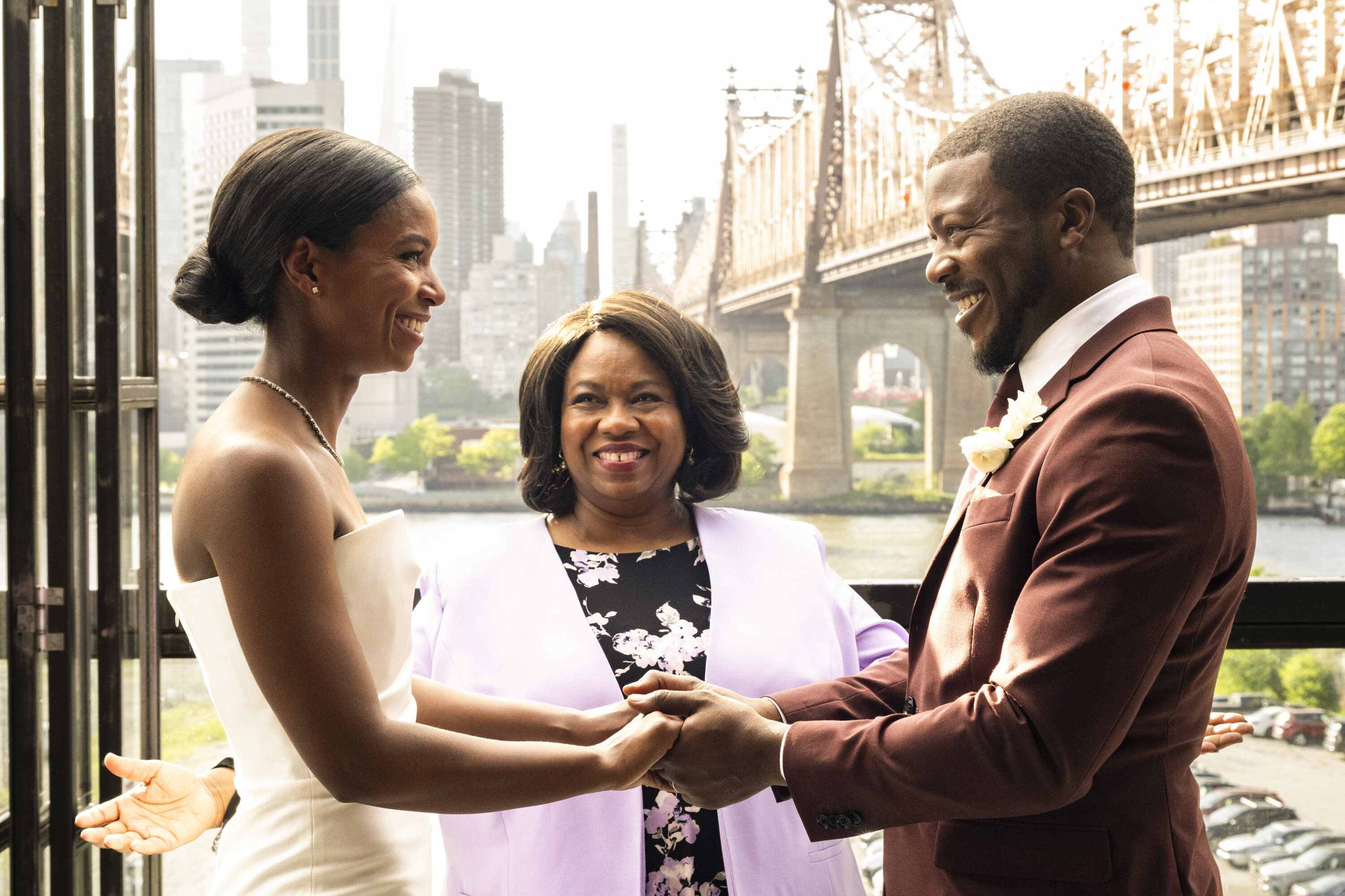 “Powderfinger” – The Fugitive Task Force races to catch the culprit threatening Manhattan with a dirty bomb. Meanwhile, Ray prepares to celebrate a major life milestone as his wedding to Cora approaches, on the fifth season finale of the CBS Original series FBI: MOST WANTED, Tuesday, May 21 (10:00-11:00 PM, ET/PT) on the CBS Television Network, and streaming on Paramount+ (live and on-demand for Paramount+ with SHOWTIME subscribers, or on-demand for Paramount+ Essential subscribers the day after the episode airs). Pictured (L-R): Caroline Harris as Cora Love, Adrienne D. Williams as Esther, and Edwin Hodge as Special Agent Ray Cannon. Photo: Mark Schafer/CBS ©2024 CBS Broadcasting, Inc. All Rights Reserved.