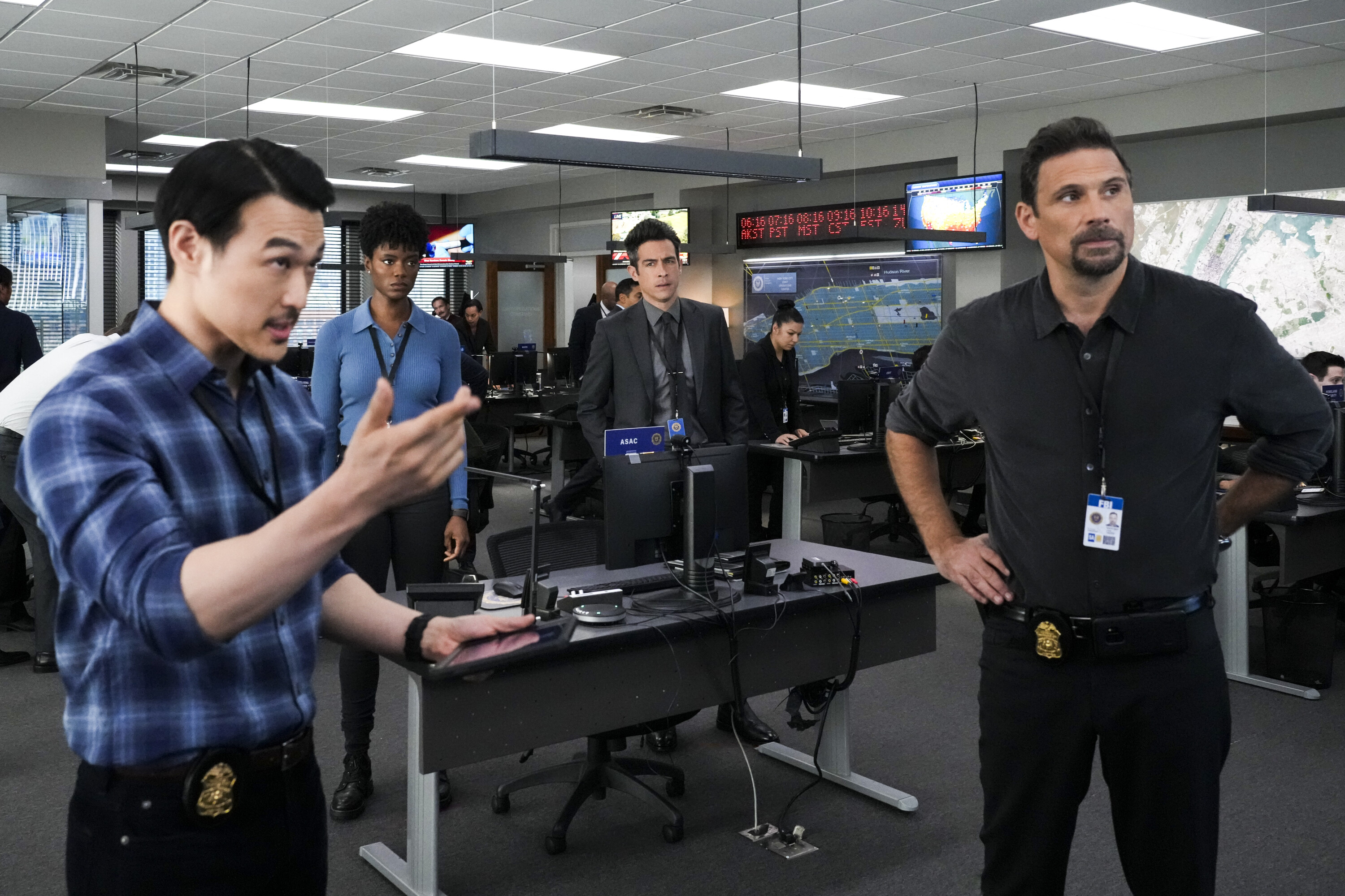 “Into the Fire” – When a deadly truck heist arms the killers with enough ammonium nitrate to construct a massive bomb, the team discovers a link to a terrorist group Maggie is working to infiltrate, on the CBS Original series FBI, Tuesday, Nov. 22 (8:00-9:00 PM, ET/PT) on the CBS Television Network, and available to stream live and on demand on Paramount+. "Into the Fire" -- Coverage of the CBS Original Series FBI, scheduled to air on the CBS Television Network. Pictured (L-R): James Chen as Ian Lim, Katherine Renee Turner as Special Agent Tiffany Wallace, John Boyd as Special Agent Stuart Scola, and Jeremy Sisto as Assistant Special Agent in Charge Jubal Valentine. Photo: Bennett Raglin/CBS ©2022 CBS Broadcasting, Inc. All Rights Reserved.