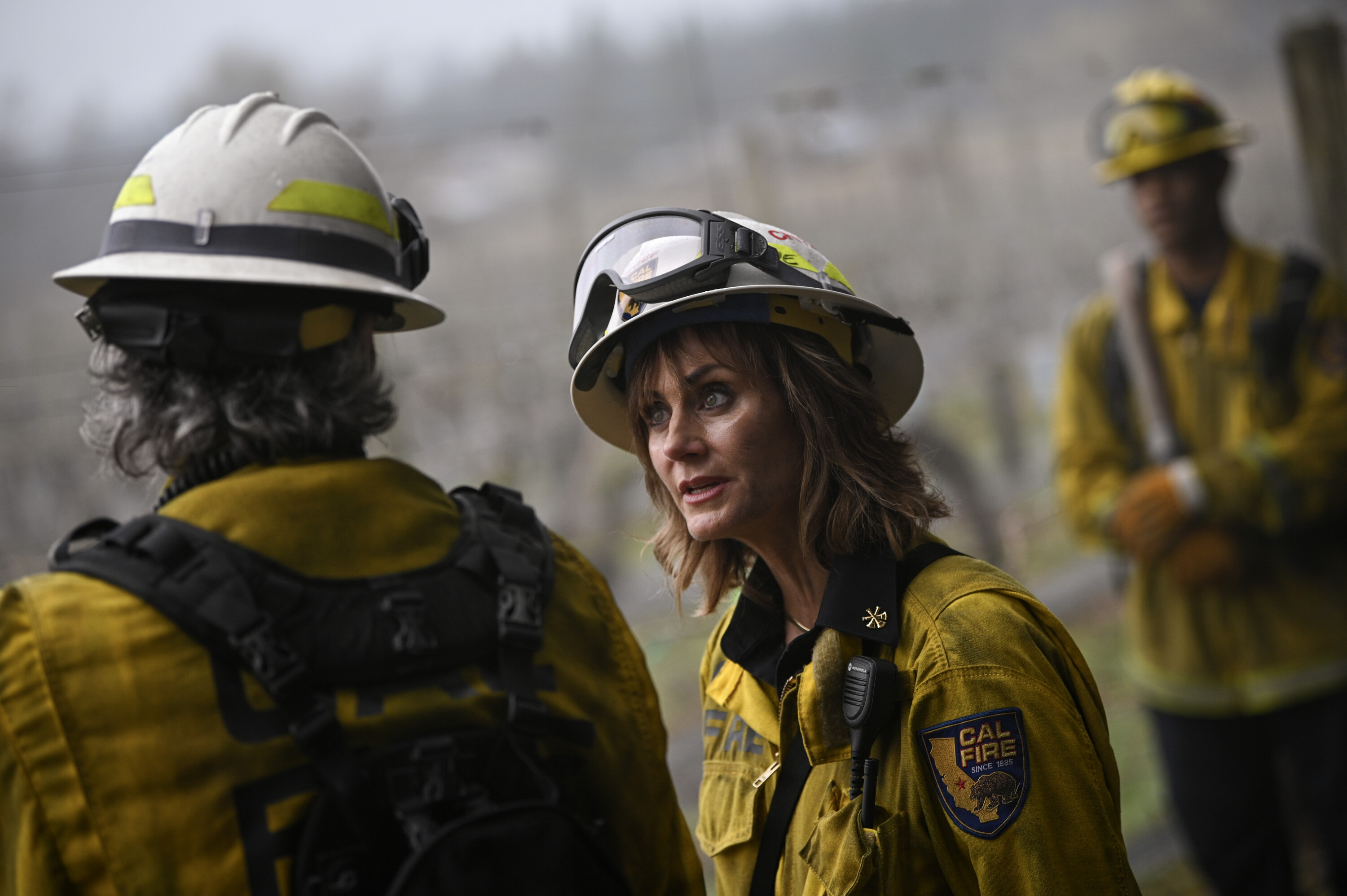 “Backfire” – The station 42 and Three Rock crews are called to a backfire started by a private firefighting company to protect a high-end winery but instead threatens to grow out of control, on FIRE COUNTRY, Friday, May 12 (9:00-10:00 PM, ET/PT) on the CBS Television Network, and available to stream live and on demand on Paramount+*. Episode directed by series star Max Thieriot. Pictured: Diane Farr as Sharon Leone. Photo: Sergei Bachlakov/CBS ©2023 CBS Broadcasting, Inc. All Rights Reserved.