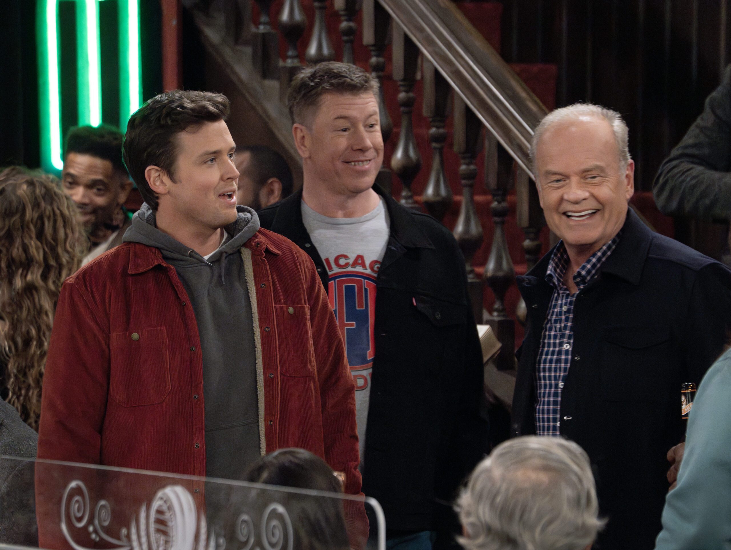 L-R: Jack Cutmore-Scott as Freddy Crane, Jimmy Dunn as Moose and Kelsey Grammer as Frasier Crane in Frasier, episode 4, season 1 streaming on Paramount+, 2023. Photo credit: Chris Haston/Paramount+