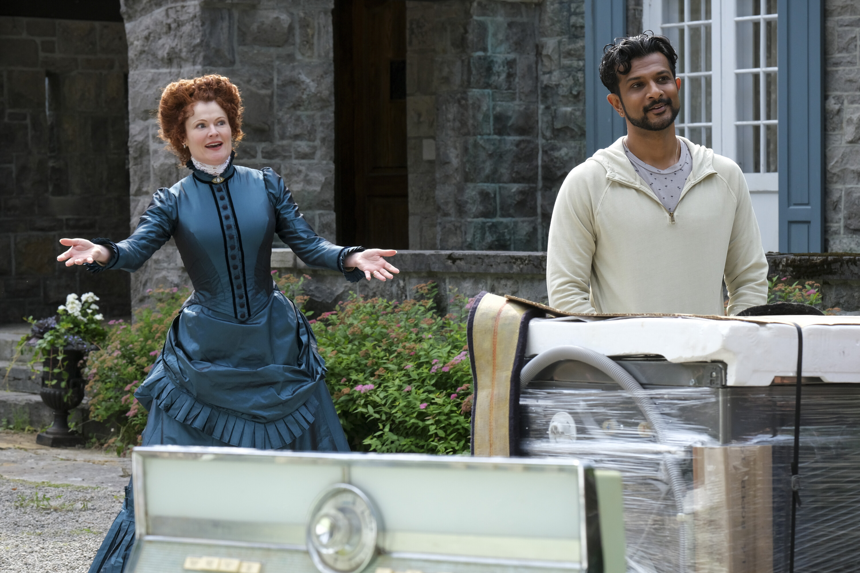 “Alberta’s Podcast” – Sam decides to host a podcast exploring the mystery surrounding Alberta’s death. Also, Hetty develops an unusual relationship with a broken washing machine, on the CBS Original series GHOSTS, Thursday, Oct. 6 (8:31-9:01 PM, ET/PT) on the CBS Television Network, and available to stream live and on demand on Paramount+. Pictured (L-R): Rebecca Wisocky as Hetty and Utkarsh Ambudkar as Jay. Photo: Bertrand Calmeau/CBS ©2022 CBS Broadcasting, Inc. All Rights Reserved.