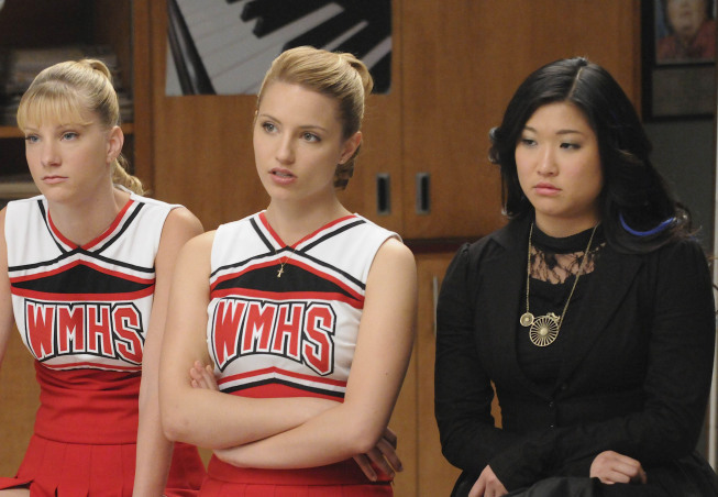 GLEE: Brittany (Hather Morris, L), Quinn (Dianna Agron, C) and Tina (Jenna UShkowitz, R) listen to Rachel's plan in the "Furt" episode of GLEE airing Tuesday, Nov. 23 (8:00-9:00 PM ET/PT) on FOX. ©2010 Fox Broadcasting Co. CR: Ray Mickshaw/FOX