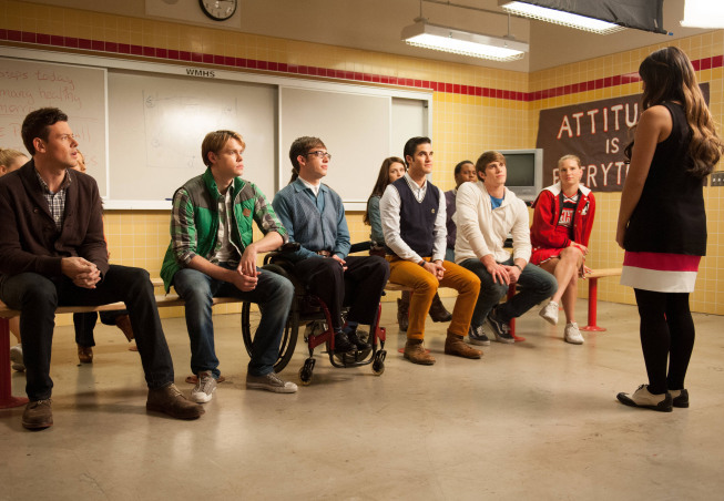 GLEE: Tina (Jenna Ushkowitz, R) asks one of the glee club members to the school dance in the "Sadie Hawkins" episode of GLEE airing Thursday, Jan. 24 (9:00-10:00 PM ET/PT) on FOX. Also pictured: L-R: Cory Monteith, Chord Overstreet, Kevin McHale, Darren Criss, Melissa Benoist, Blake Jenner, Alex Newell and Heather Morris. ©2013 Fox Broadcasting Co. CR: Eddy Chen/FOX