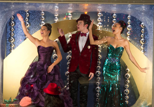 GLEE: Rachel (Lea Michele, L), Kurt (Chris Colfer, C) and Santana (Naya Rivera, R) perform in the "Previously Unaired Christmas" Fall Finale episode of GLEE airing Thursday, Dec. 5 (9:00-10:00 PM ET/PT) on FOX. ©2013 Fox Broadcasting Co. CR: Adam Rose/FOX