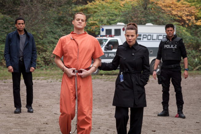 ALMOST HUMAN: Capt. Maldonado (Lili Taylor, second from R) escorts Ethan (guest star Alex Miller, second from L) in the "Blood Brothers" episode of ALMOST HUMAN, airing Monday Dec. 9 (8:00-9:00 PM ET/PT) on FOX. Also pictured L-R: Michael Ealy and Karl Urban. ©2013 Fox Broadcasting Co. Cr: Liane Hentscher/FOX
