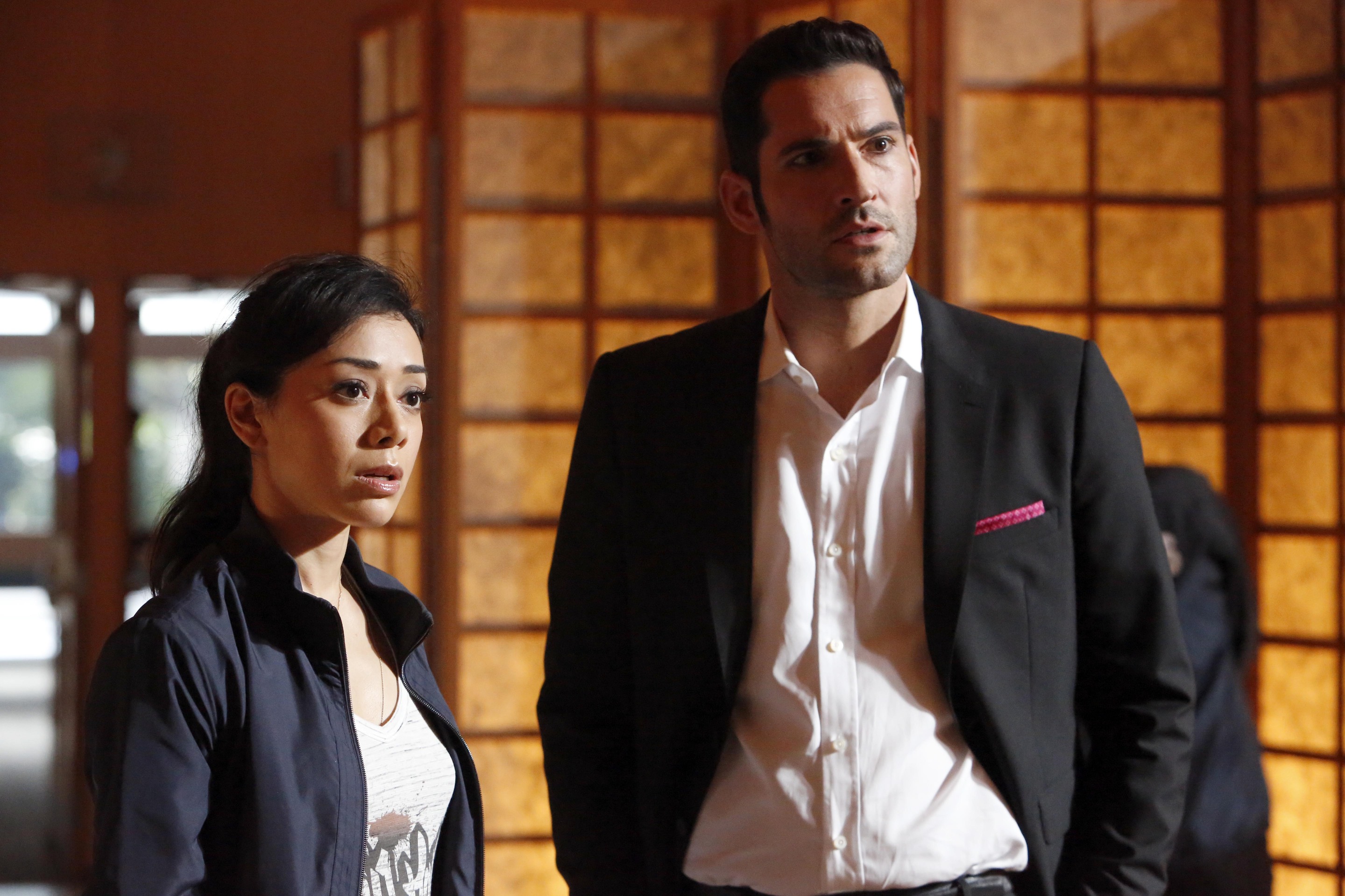 LUCIFER: L-R: Aimee Garcia and Tom Ellis in the "Trip To Stabby Town" episode of LUCIFER airing Monday, Nov. 14 (9:01-10:00 PM ET/PT) on FOX. ©2016 Fox Broadcasting Co. Cr: Bettina Strauss/FOX