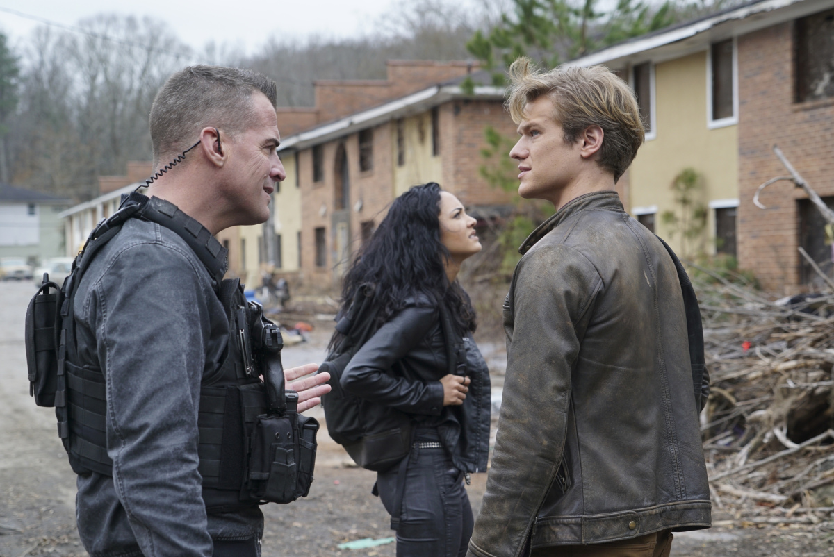 MacGyver stars Lucas Till (Angus “Mac” MacGyver), George Eads (Jack Dalton), Justin Hires (Wilt Bozer), Tristin Mays (Riley Davis), Meredith Eaton (Matty Webber), and Isabel Lucas (Samantha Cage).