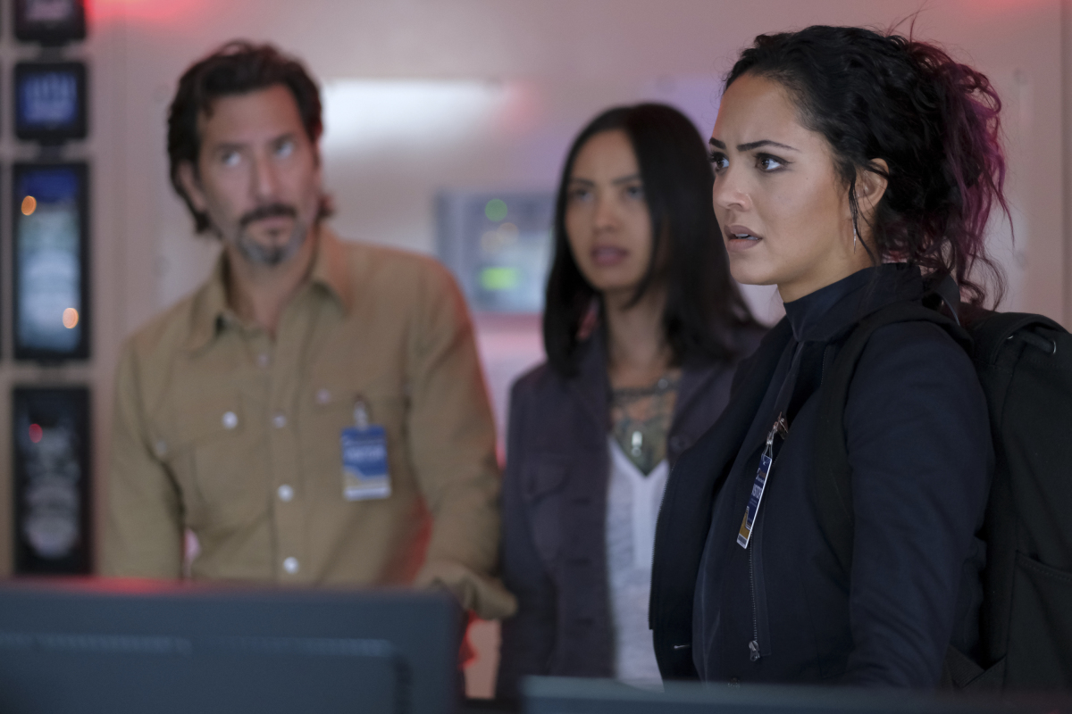 "Code + Artemis + Nuclear + N3mesis" -- While Mac's friends surround him during his time of grief, Los Angeles' power grid is taken hostage in a ransomware attack resulting in a citywide blackout, and the team discovers the code used was written by Riley years ago, on MACGYVER, Friday, April 10 (8:00-9:00 PM, ET/PT) on the CBS Television Network. Tate Donovan returns as Oversight. Pictured: Henry Ian Cusick as Russ Taylor, Tristin Mays as Riley Davis, Levy Tran as Desi Nguyen. Photo: Mark Hill/CBS ©2019 CBS Broadcasting, Inc. All Rights Reserved