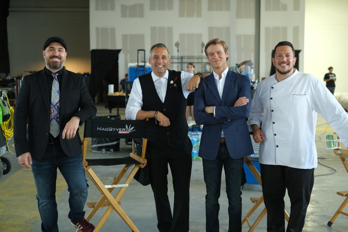 "Mac + Desi + Riley + Aubrey" -- A double date descends into chaos when Mac and Desi witness a murder in the back of the restaurant, and as they work to find the killer, Riley tries to keep the secret about her and her friends "day jobs" from her new boyfriend, Aubrey (Leonardo Nam), on MACGYVER, Friday, March 27 (8:00-9:00 PM, ET/PT) on the CBS Television Network. The comedians Impractical Jokers guest star as restaurant employees. Pictured: Three members of the Imprctical Jokers troupe, Brian Quinn, Joe Gatto, Sal Vulcano, with Lucas Till as Angus "Mac" MacGyver, on set. Photo: Mark Hill/CBS ©2019 CBS Broadcasting, Inc. All Rights Reserved