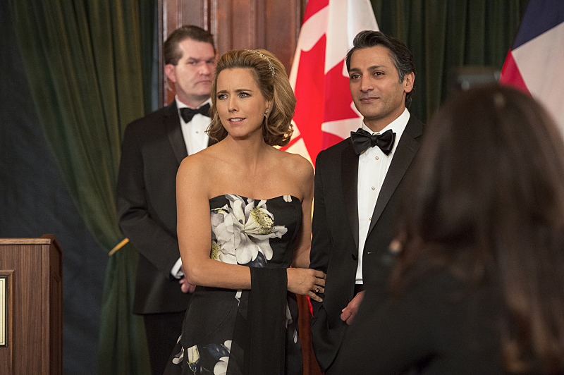 "Connection Lost"-- When President Dalton gets word that the world's most wanted terrorist, Jibral Disah, is hiding in Islamabad, he sends the "Murphy Station" -- Henry, Jane and Jose -- on a dangerous mission. Also, Elizabeth and Henry go to couples therapy to keep their relationship on track, on MADAM SECRETARY, Sunday, April 24 (8:00--9:00 PM, ET/PT) on the CBS Television Network. Pictured L-R: Téa Leoni as Elizabeth McCord and Hari Dhillon as Pakistan Foreign Minister Konstantin Abedi Photo: David Giesbrecht/CBS é2016 CBS Broadcasting, Inc. All Rights Reserved