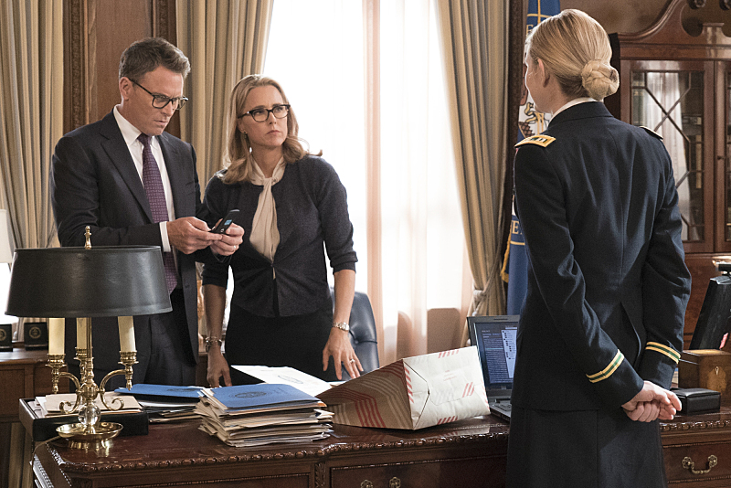 "French Revolution"-- When an imminent U.S.-France state dinner is jeopardized after a CIA operative is captured by French intelligence, Elizabeth must negotiate the operative's release while keeping the event on track. Also, Russell tries to woo back big donors to Dalton's campaign, and the McCords get an important lead in their family's stalking case, on MADAM SECRETARY, Sunday, Nov. 6, 2016 (9:30-10:30 PM, ET/PT) on the CBS Television Network. Pictured L-R: Tim Daly as Henry McCord, Téa Leoni as Elizabeth McCord, and Justine Lupe as Captain Ronnie Baker Photo: David M. Russell/CBS é2016 CBS Broadcasting, Inc. All Rights Reserved
