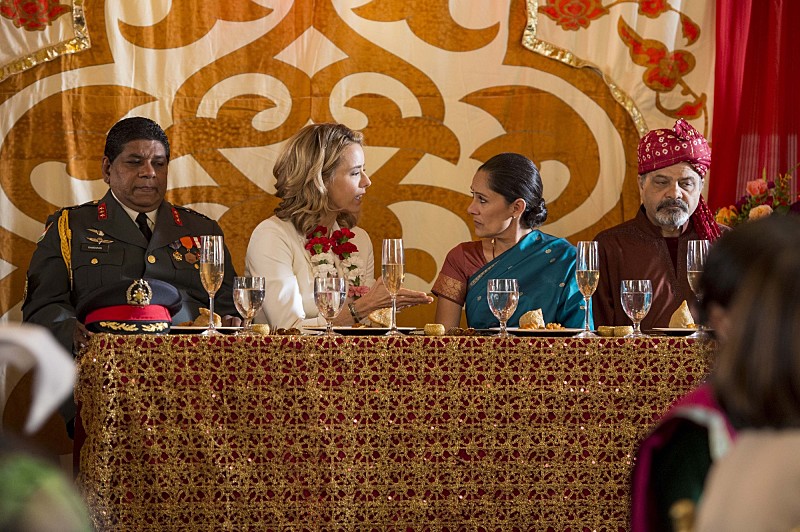 Passage -- When Elizabeth brings Alison with her to India on her first state department trip abroad, she's thrown into crisis mode when a massive earthquake hits that causes an explosion at an American-owned factory, and she's separated from Alison during the chaos, on MADAM SECRETARY, Sunday, Nov. 2 (8:31-9:30 PM, ET/8:01-9:00 PM, PT) on the CBS Television Network. Elizabeth McCord (Téa Leoni), second from left, and Foreign Minister Chondita Samant (Sakina Jaffrey), shown. Photo: David Giesbrecht/CBS ©2014 CBS Broadcasting, Inc. All Rights Reserved