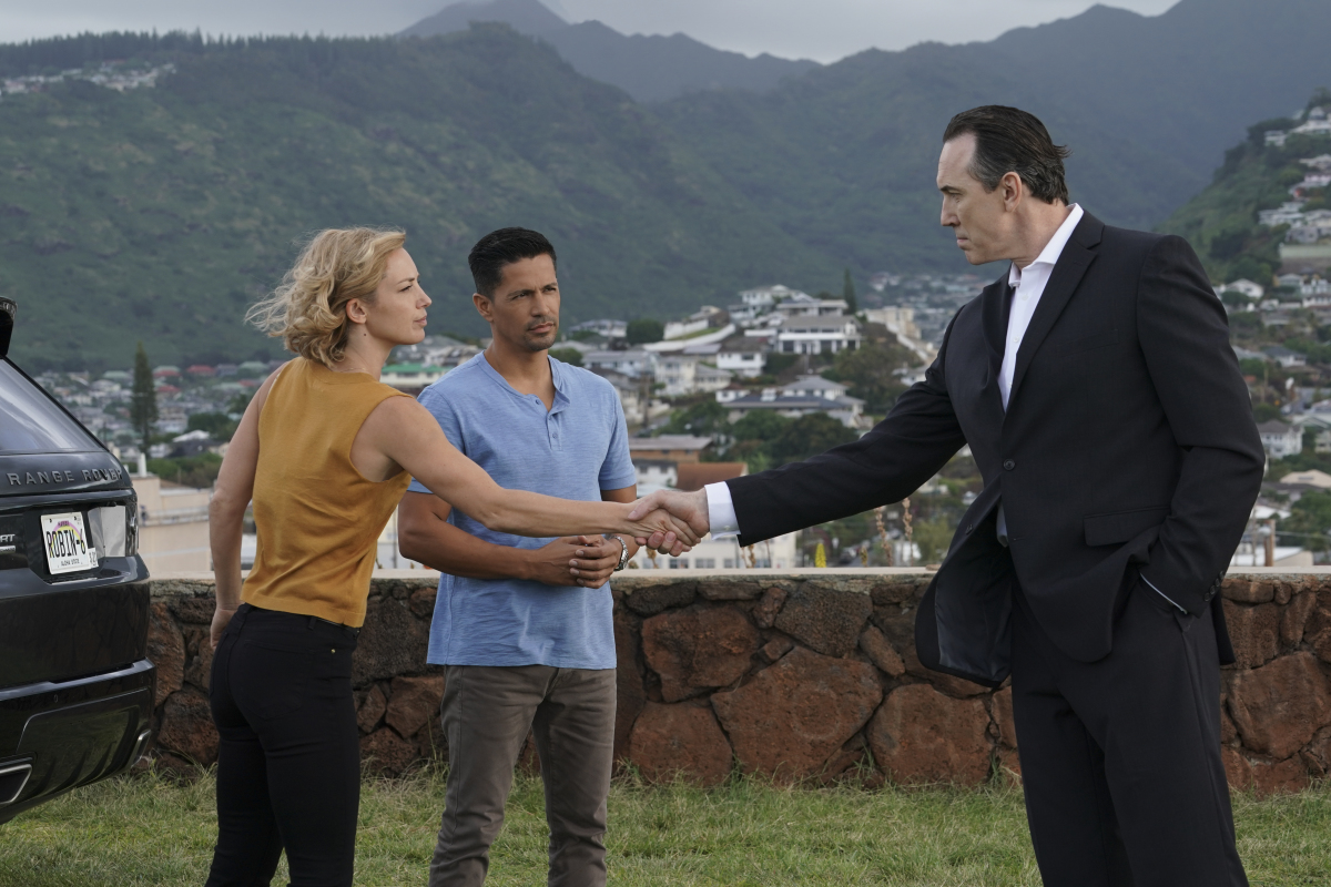 “Bloodline” – Magnum and Higgins work a stalking case involving a a man with a past in espionage. Also, Ethan asks Higgins to join him on an extended trip for Doctors Without Borders just as Magnum starts to open up to other possibilities, on the third season finale of MAGNUM P.I., Friday, May 7 (9:00-10:00 PM, ET/PT) on the CBS Television Network. Pictured L-R: Perdita Weeks as Juliet Higgins, Jay Hernandez as Thomas Magnum, and Ego Mikitas as Andrei Tarasova Photo: Karen Neal/CBS ©2021 CBS Broadcasting, Inc. All Rights Reserved.