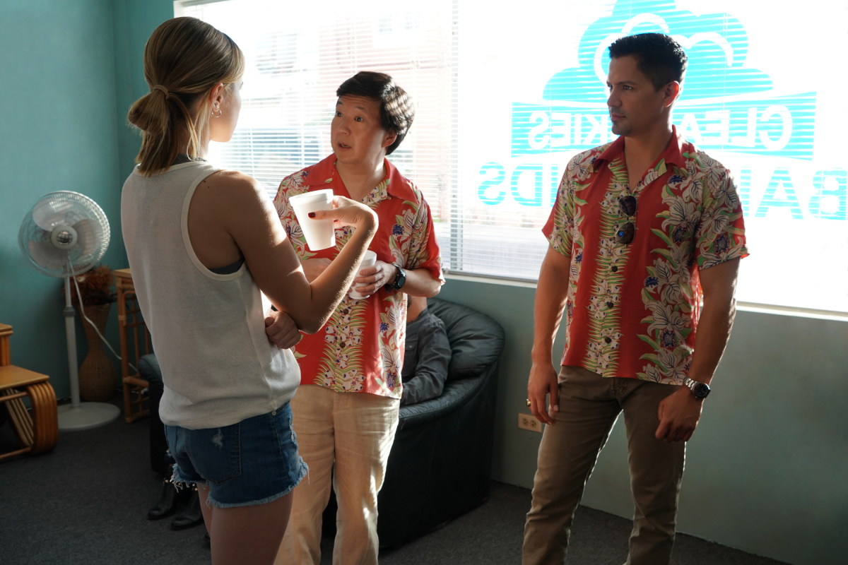 "Winner Takes All" -- Magnum has an emotional connection to a case when he and every other private investigator and bounty hunter on Oahu are tasked to track down a man (Jake Matthews) accused of murder, on MAGNUM P.I., Sunday, Jan. 20 (directly after the AFC Championship Game) on the CBS Television Network. Pictured L-R: Halston Sage as Willa Stone, Ken Jeong as Luther H. Gillis, and Jay Hernandez as Thomas Magnum Photo: Karen Neal/CBS é2018 CBS Broadcasting, Inc. All Rights Reserved