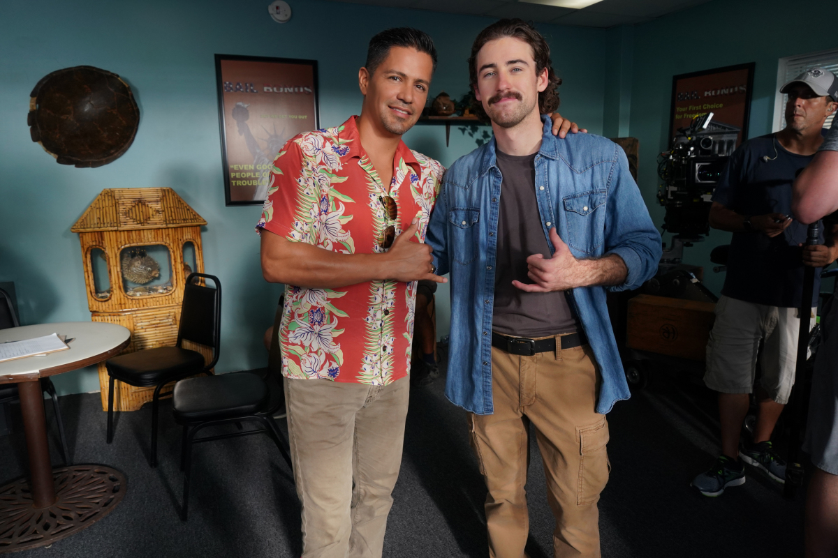 "Winner Takes All" -- Magnum has an emotional connection to a case when he and every other private investigator and bounty hunter on Oahu are tasked to track down a man (Jake Matthews) accused of murder, on MAGNUM P.I., Sunday, Jan. 20 (directly after the AFC Championship Game) on the CBS Television Network. Pictured L-R: Behind the scenes with Jay Hernandez as Thomas Magnum and NASCAR driver Ryan Blaney as Shane Powell Photo: Karen Neal/CBS é2018 CBS Broadcasting, Inc. All Rights Reserved