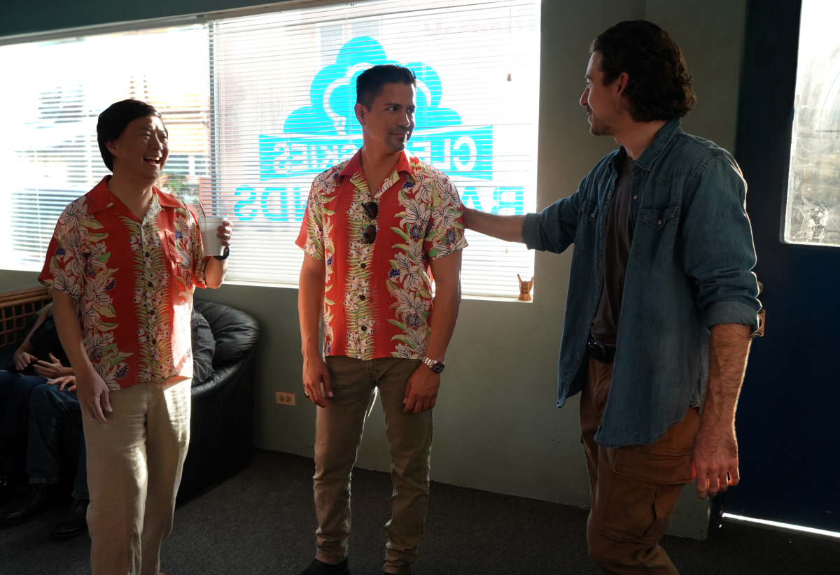 "Winner Takes All" --Magnum has an emotional connection to a case when he and every other private investigator and bounty hunter on Oahu are tasked to track down a man (Jake Matthews) accused of murder, on MAGNUM P.I., Sunday, Jan. 20 (directly after the AFC Championship Game) on the CBS Television Network. Pictured L-R: Ken Jeong as Luther H. Gillis, Jay Hernandez as Thomas Magnum, and NASCAR driver Ryan Blaney as Shane Powell Photo: Karen Neal/CBS é2018 CBS Broadcasting, Inc. All Rights Reserved