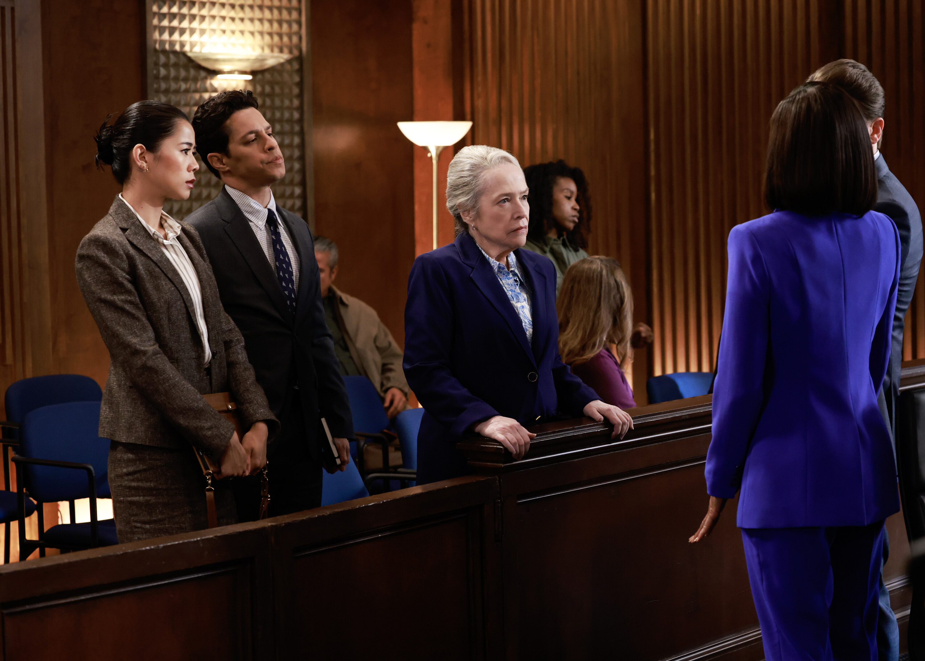 “Sixteen Steps” – As Olympia and Julian get a second shot at a case regarding a tragic death due to contaminated baby formula, their past work on the investigation gives glimpses into what led to their divorce. Also, Matty’s overwhelming stress causes her to consider quitting, on MATLOCK, Thursday, Nov. 14 (9:01-10:00 PM, ET/PT) on the CBS Television Network, and streaming on Paramount+ (live and on demand for Paramount+ with SHOWTIME subscribers, or on demand for Paramount+ Essential subscribers the day after the episode airs)*. Pictured (L-R): Leah Lewis as “Sarah Franklin”, David Del Rio as “Billy Martinez”, and Kathy Bates as “Madeline Matlock”. Photo: Sonja Flemming/CBS ©2024 CBS Broadcasting, Inc. All Rights Reserved.